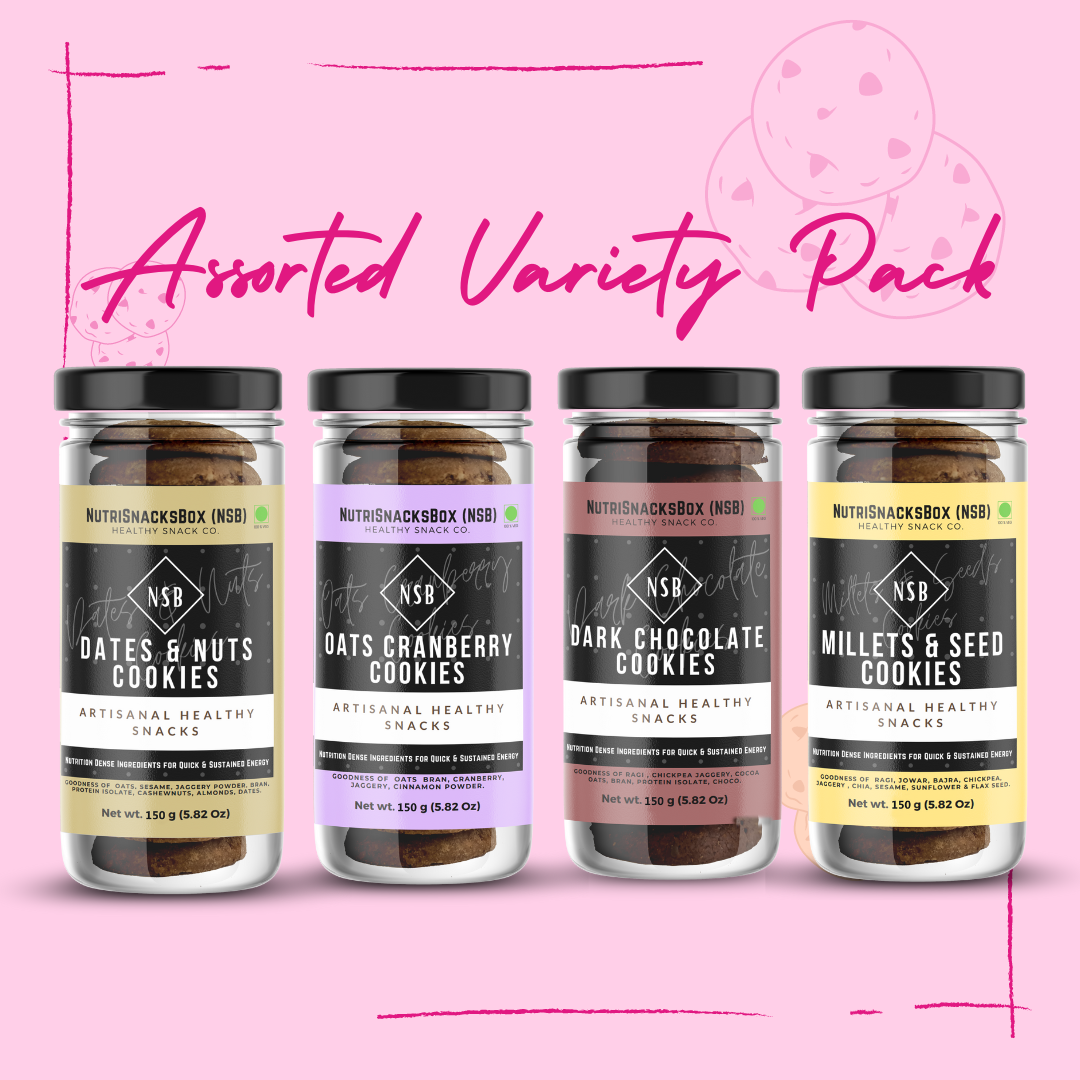 The Cookie Assorted Pack has four distinct flavors: 1 box each of Millets and Seeds Cookies (150g), Multigrain Dark Chocolate Cookies (150g), Dates & Dry Fruit Nuts Cookies (150g), and Oatmeal and Cranberries Cookies (150g).