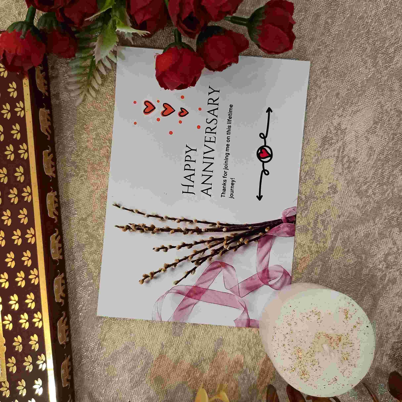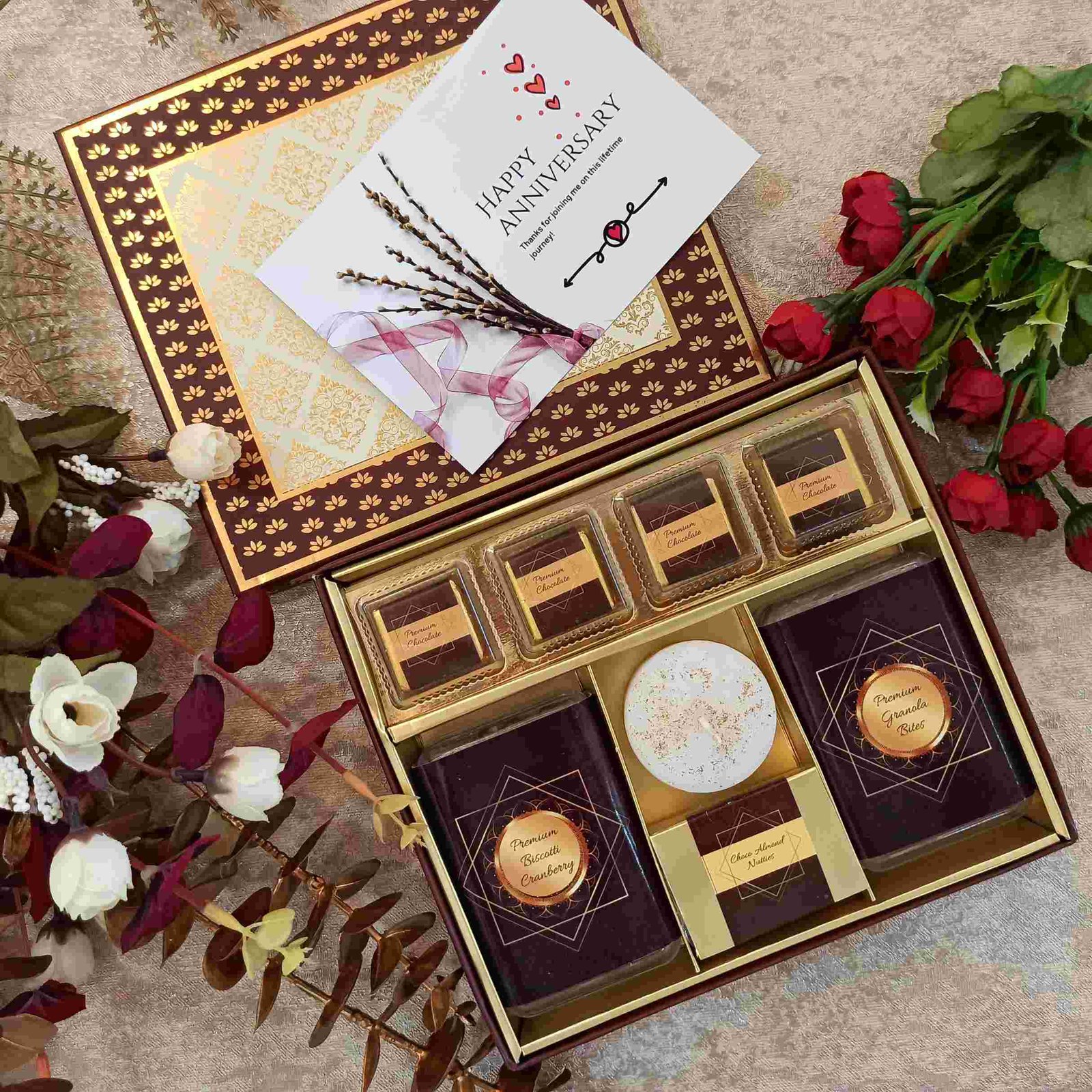 • ANNIVERSARY GIFT HAMPER CONTAINS: Premium Granola Bites ( 50g), Premium Biscotti Cranberry ( 50g),  Choco Almond Nutties  ( 40g), Chocolate Nuttie Truffle Square ( 48g) & Elegant Candle ( 1pc) Packed in Festive Golden Foiling Box with “Happy Anniversary” Greeting Card.